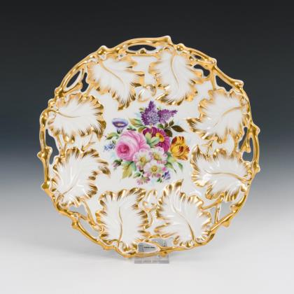 Durchbruchteller mit reicher floral-ornamentaler Goldbemalung. Im Spiegel die Darstellung einer Landschaft mit zwei badenden Frauen