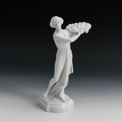 Stehender, eine Platte mit Früchten tragender Frauenakt