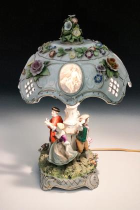 Reich blütenbelegter Schirm mit Gitterdurchbruch und vier erotischen Lithophaniemedaillons, zwei um den Schaft tanzende Paare, Rocaillesockel. Elektrifiziert (intakt)