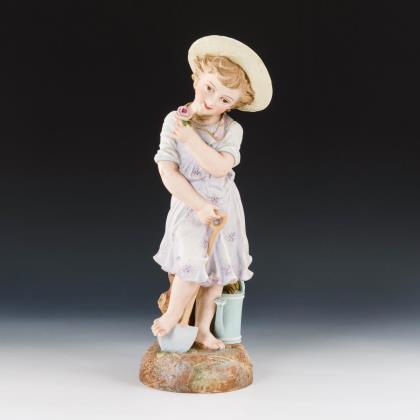 Gärtnermädchen mit Spaten, Gießkanne und Rose