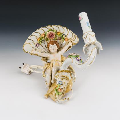An einem Rocailleleuchter lagernder, eine Schale haltender Putto