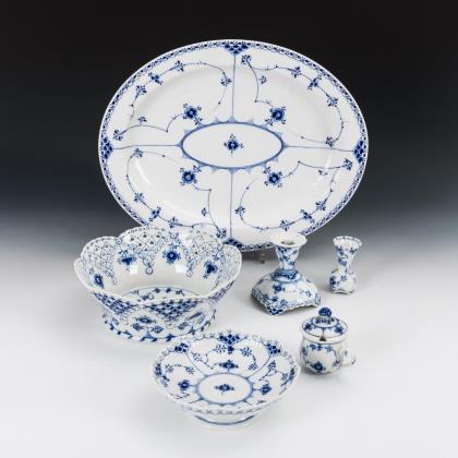 Ovalplatte (L 41,5 cm), Schale (Ø 23 cm), Fußschale (Ø 17,5 cm), Kerzenleuchter (H 10 cm9, Väschen (H 7,5 cm) und Senftöpfchen (H 8,5 cm)