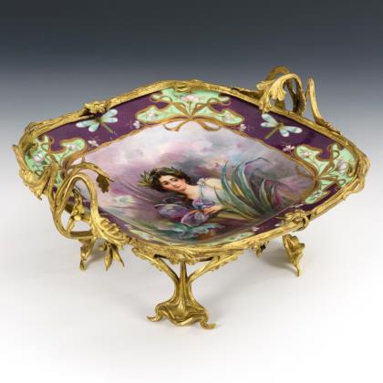 Rechteckige Schale mit violettem und grünem Teilfond auf der Fahne, im Spiegel die feine Malerei einer lorbeerbekränzten jungen Frau zwischen Schwertlilien. Florale Bronzemontierung mit zwei Handhaben und vier Füßen