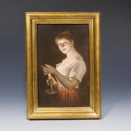 Nach dem Gemälde "Gute Nacht" von Georg Holm (1838 Frankfurt am Main - 1911 Berlin). Farbig bemalt von Rudolf Dittrich, signiert. Neuwertiger Profilrahmen, 29,5 x 20,5 cm. Unglasierter Boden, ohne Marke