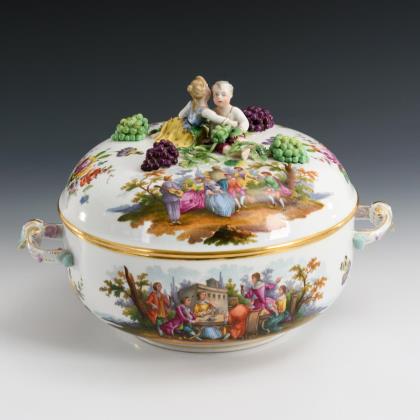 Terrine mit Rocaillehenkeln sowie einem Deckel mit Kinderpaar mit Trauben als Knauf. Aufwändig bemalt mit figurenreichen Parklandschaften