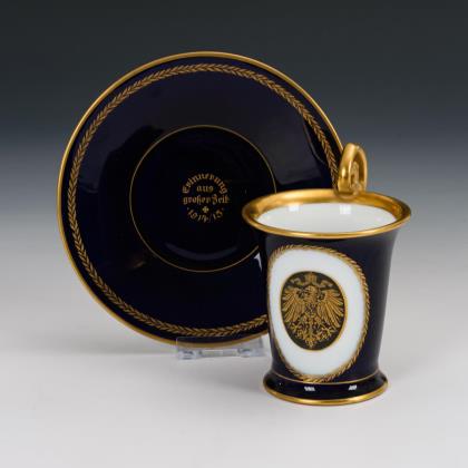 Schauseitig auf der Tasse ein Ovalmedaillon mit der Darstellung des Reichsadlers, im Spiegel der Untertasse die Bezeichnung "Erinnerung aus großer Zeit 1914/15"