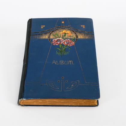 Nur Ansichten der Stadt, teils Straßenkarten, vor 1945. Blaues Album mit Nelken und Jugendstilornament