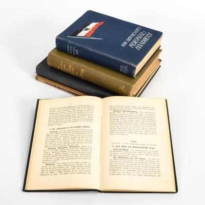Schmidt, Rochus: "Hermann von Wißmann und Deutschlands koloniales Wirken". Berlin o.J., 132 Seiten und Karte. / Scheel: "Deutschlands Kolonien in achtzig farbenphotgraphischen Abbildungen", Berlin 1912, 159 Seiten und Karte. / Peters: "Im Goldland des Altertums - Forschung zwischen Sambesi und Sabi", München 1902, 408 Seiten mit Abbildungen. / "von der Heydt's Kolonial-Handbuch . Handbuch der deutschen Kolonial- und Uebersee-Unternehmungen", Berlin 1912, 380 Seiten. / Krüger: "Die deutschen Kolonien - Erdkundliche Umrisse und Charakterbilder von unsern überseeischen Schutzgebieten", Danzig 1906, 104 Seiten, mit einigen Karten