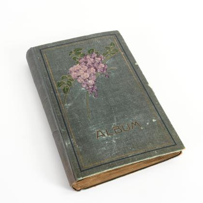 Kitsch-, Glückwunsch- und Blumenkarten, einige in Französisch, vor 1945. Graues Album mit dezentem Muster, "Postkarten-Album"