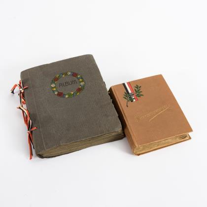 Hauptsächlich Kitsch- und Spruchkarten zum Thema, einige in Französisch und wenige bis 1938. Graues Album mit Blumenkranz und braunes Album "Kriegserinnerungen"