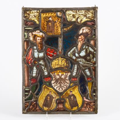 2 Ritter flankieren das Wappen mit Doppeladler und Kaiserkrone. 3 kleinere Begleitfiguren (Gelehrte?) sowie Ornamentfragmente im Hintergrund