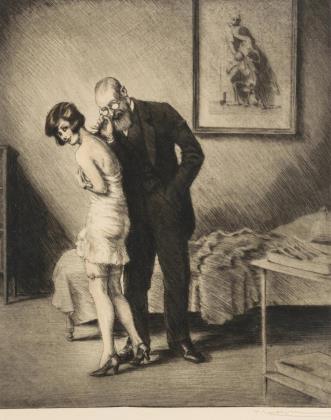 Erotische Szene mit lasziver Schönheit und älterem Herren in einem Untersuchungszimmer, im Stile Max Brünings