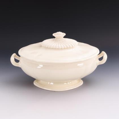 Ovale Zwei-Henkel-Form mit geschweift gebuckelter Wandung und abgesetztem Fuß, Deckel mit Reliefblütenknauf