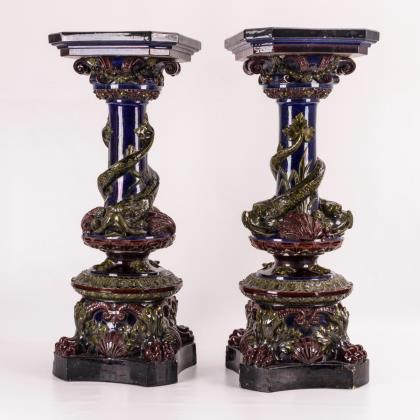 2-teilige Reliefsäulen mit Fischwesen und Fröschen