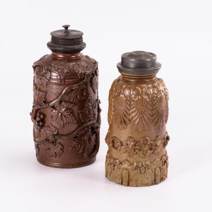 Zylindrische Flaschen mit floraler Auflagenzier, Zinnverschlüsse