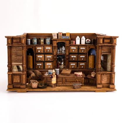 Schöner Kaufladen mit abnehmbaren Frontelementen, bestehend aus je 2 vorgestellten Säulen, Schaufenster und Rolladen. Fester Ladeneinbau mit verspiegeltem Mittelfach, 12 Schüben und 2 Halbbögen an den Seiten. Eingerichtet mit Fässern (Holz und Blech), Blechdosen, Porzellan, Glas etc. Elektrifiziert, Funktion nicht geprüft