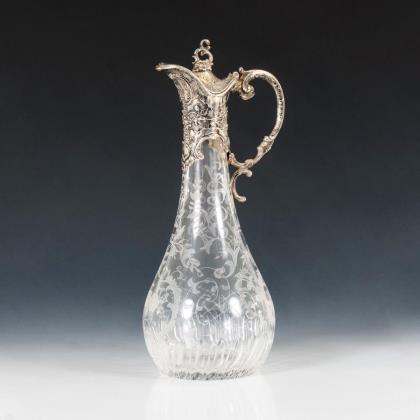 Floral beschliffener Klarglaskorpus. Reliefierte Silbermontierung mit Henkel und Scharnierdeckel