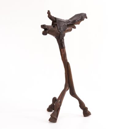Dreibein mit Hufen, langer Eselskopf mit Zähnen in der durchgehenden Mund-Bohrung, aufgesetzter Vogel mit Ledersattel