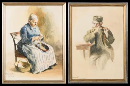Ältere Frau beim Kartoffeln schälen sowie Porträt eines älteren Mannes beim Spielen der Flöte