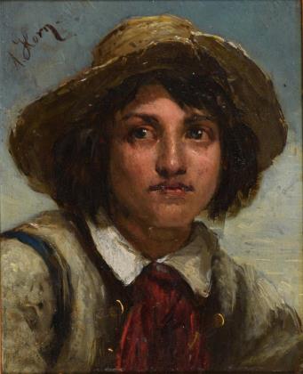 Bildnis eines Jungen mit lädiertem Hut unter blauem Himmel