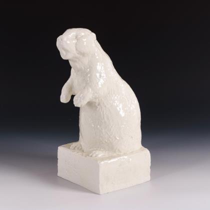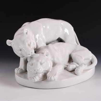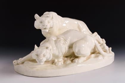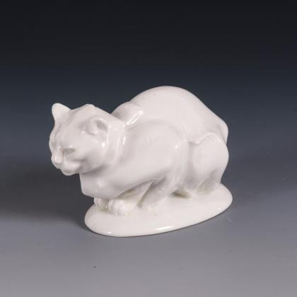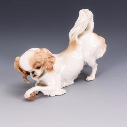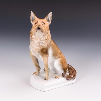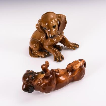 1x Rosenthal, 1938, Modell-Nr. 1247, Entwurf 1933 von Theodor Kärner (1884 Hohenberg an der Eger - 1966 München): sitzender Dackelwelpe (H 14,5 cm). / 1x ENS, Anfang 20. Jh., Modell-Nr. 10: auf dem Rücken liegender Dackel (L 21 cm)