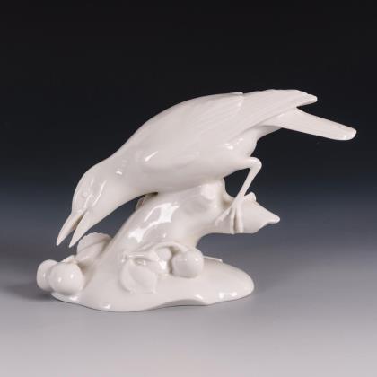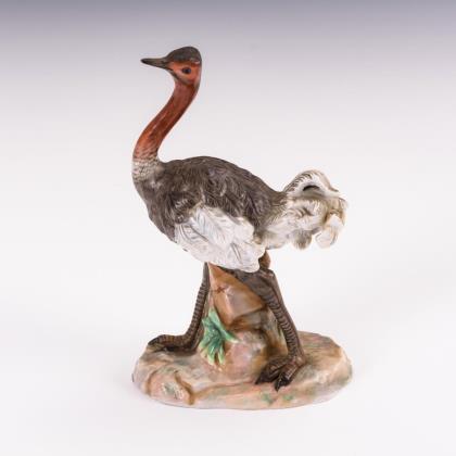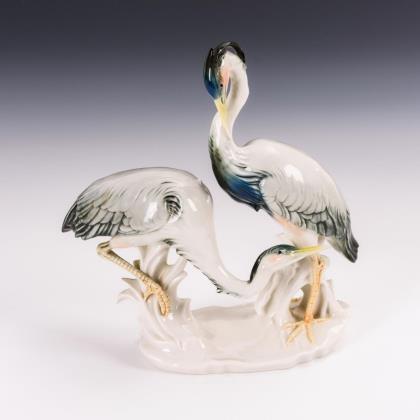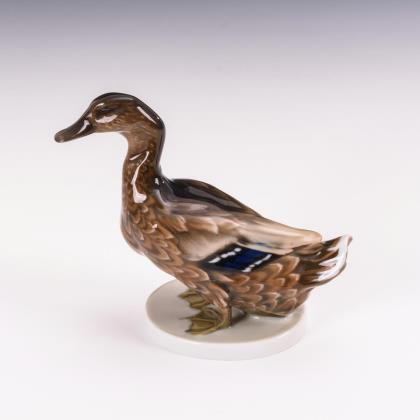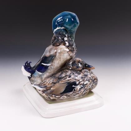 Auf einem Quadratsockel sitzende Ente sowie ein sich das Gefieder putzender Erpel