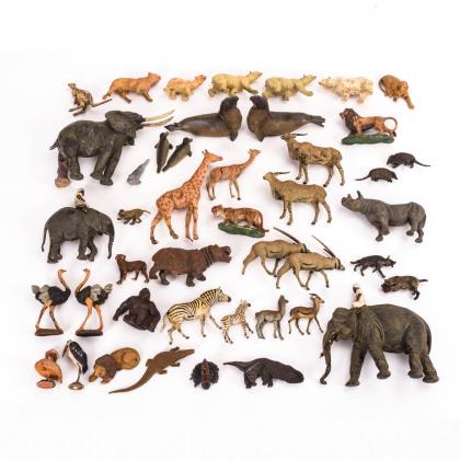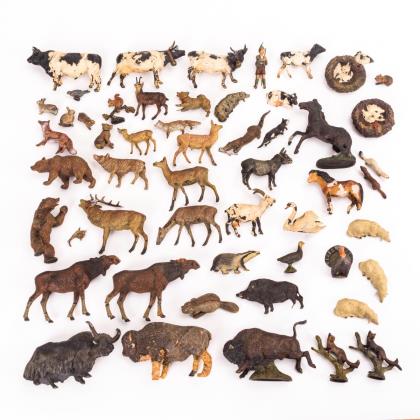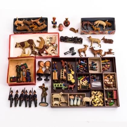 Umfangreiches Konvolut mit teils frühen Figuren. Darunter 2 Grotesk-Figuren mit beweglichen Köpfen, Reifentiere, Figuren, Fuhrwerke, Massetiere, Engelchen sowie einige Soldaten