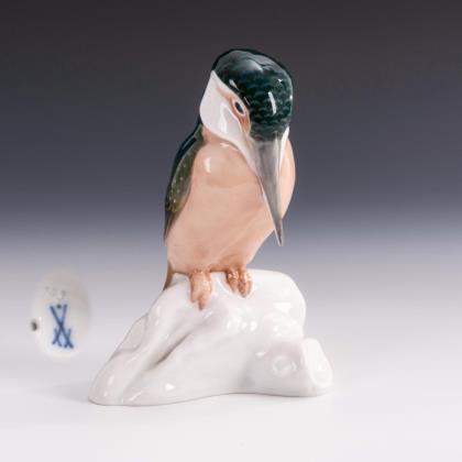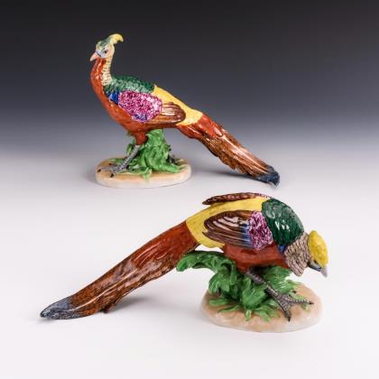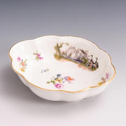 Vierpassschale mit Rocaillerelief. Auf der Fahne zwei sehr fein gemalte Landschaftsinseln mit Hahn und Tauben bzw. Schwan und Haubentauchern