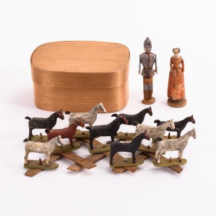 Kleine Holzschere in Spanschachtel, dazu 10 Pferdchen und 2 gedrechselte Figuren als Soldat und Frau
