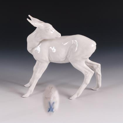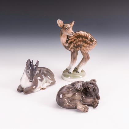 Rehkitz (H 17,5 cm), liegendes Rehböckchen (H 9 cm) und spielender kleiner Bär (H 6 cm)