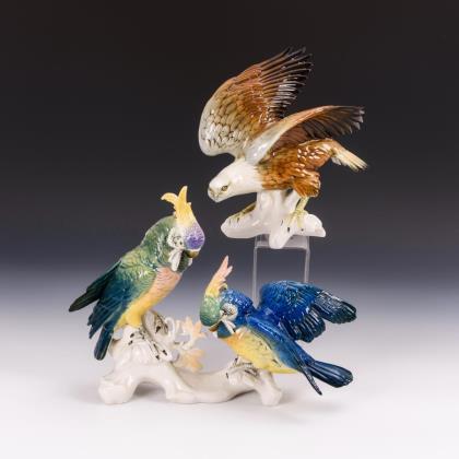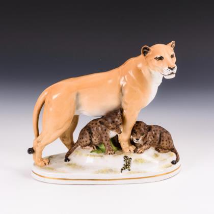 9 Archetiere von Carl Weidemeyer, Bremen: 2 Eisbären, 2 geduckte Leoparden, 3 Flamingos, 1 Löwe, 1 Ameisenbär. Dazu 3 Zaunelemente