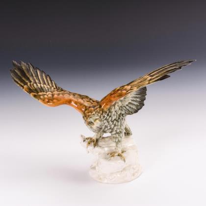 Auf einem Felsen stehender Adler mit ausgebreiteten Schwingen