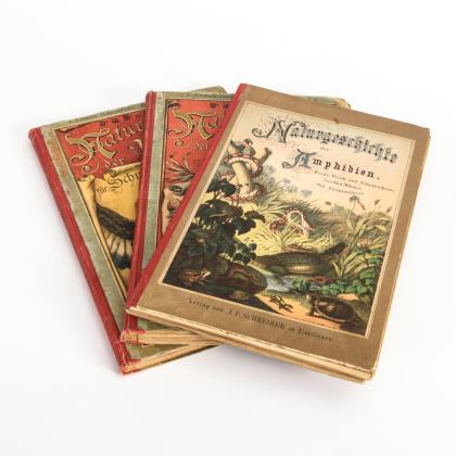 Naturgeschichte der Säugethiere"; "Naturgeschichte der Vögel" und "Naturgeschichte der Amphibien, Fische, Weich- und Schalenthiere, Insekten, Würmer und Strahlenthiere". Alle mit zahlreichen Farblithographien, Halbleineneinband