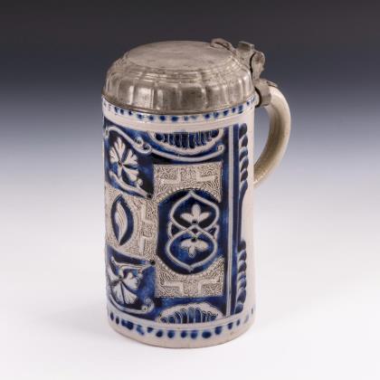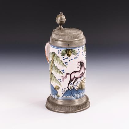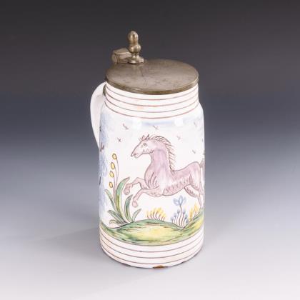 Zylinderkrug mit strichverziertem Bandhenkel. Schauseitig ein springendes Pferd zwischen Nadelbäumen. Prunkvolle Zinnmontierung mit profiliertem Deckel und großem Kugeldrücker, graviert "JAN 1798", Henkelband und hoher Zinnstand