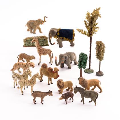 Verschiedene Tuchstaubtiere, meist Wildtiere: Giraffe, Kamel, Ziege, Tiger, 2 Löwen, 3 Elefanten (davon 1x Metall mit Tuchstaub), Wildschwein aus Masse etc. Dazu 1 Palme, 1 Luffahecke und 2 Luffabäume