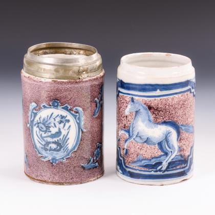 Zylindrische Krüge mit springendem Pferd (H 16,5 cm) und Kartusche mit Vogelmotiv (H 16 cm)