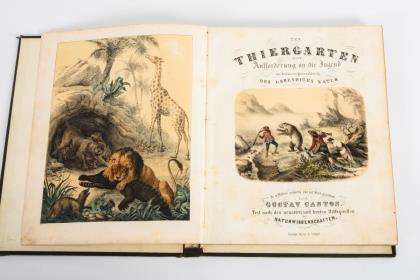 Ca. 20 Blätter mit Farblithographien und dazugehörigen Textseiten. Tierdarstellungen, oft mit Jagdszenen durch Tier und Mensch