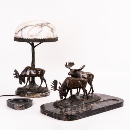 Auf teppichartiger Bronze-Plinthe stehender, prächtig geschmückter Elefant mit turmartigem Streichholzhalter und seitlichen Muschelschalen