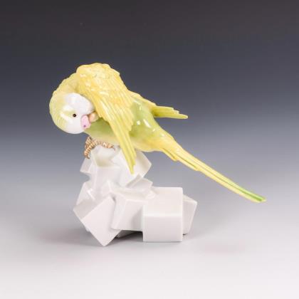 Auf einem Steinsockel sitzender Wellensittich bei der Gefiederpflege