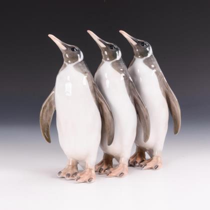 Seltene Plastik von drei in einer Reihe stehenden Pinguinen