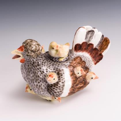 Teekanne in Gestalt einer sitzenden Henne, aus deren Gefieder die Küken herausschauen