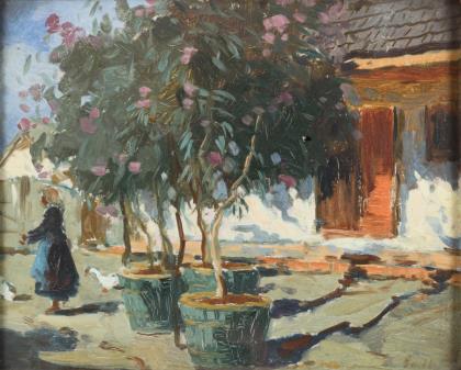 Ungarischer Maler: Sonniger Bauernhof mit Enten und Bauersfrau