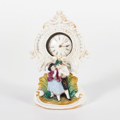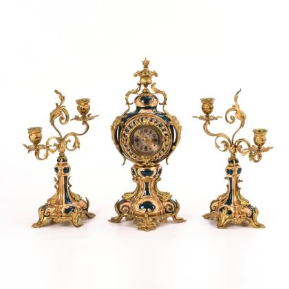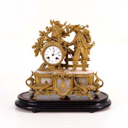 Portikus mit verspiegelter Rückwand, 2 Säulen und zentralem Reitermotiv auf hohem Sockel, bekrönende Uhrentrommel in Lyraform, Rundbogenabschlüsse und florale Zierbeschläge