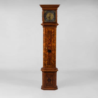 Säulenuhr mit Profilleisten und geschweiften Elementen, floralen Marketerien mit Tauben und einer ergänzten Urnenbekrönung