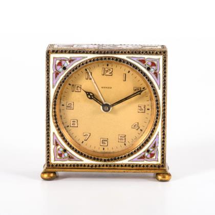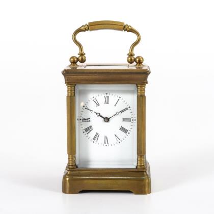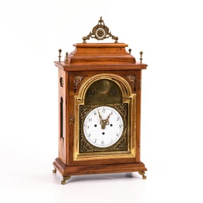 4-seitig verglaste Stutzuhr mit Rundbogenfeld und bekrönendem Zierbügel