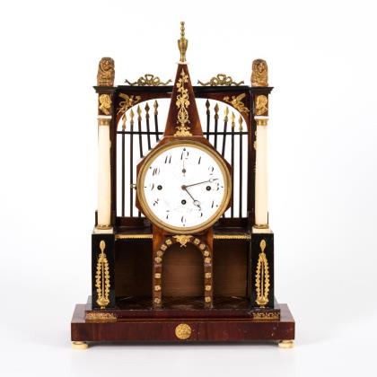 Architektonisch gestaltete Klassizismus-Uhr mit rückwandigem Lanzengitter, oktogonaler Uhrentrommel mit pyramidalem Abschluss, Rundbögen, Säulen und Zierbeschlägen mit floralen und figürlichen Motiven, zweifarbig furnierter Boden mit Schrägbändern