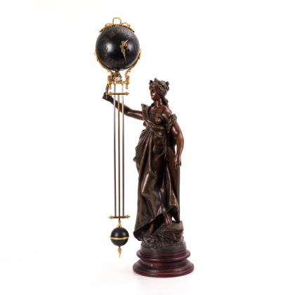 Auf einem Buch stehende antikisierende Frauenplastik mit Reißbrett, Natursockel bezeichnet "Aug[uste] Moreau", auf ergänzter und rot gebeizter Holzplinthe mit Plakette "Science par Auguste Moreau". Erhobener rechter Arm mit Blattstengel als Träger einer schwingenden Kugeluhr mit römischen Ziffern und Louis Quinze-Zeigern