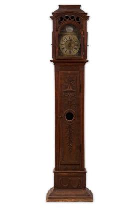 Frontseitig verglastes Historismus-Gehäuse mit geschweifter Krone und langem Pendelbrett, Schnitzrelief mit Floralwerk und Maskaronen