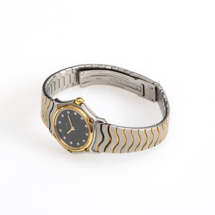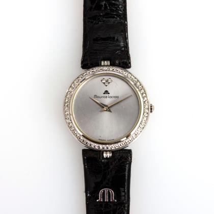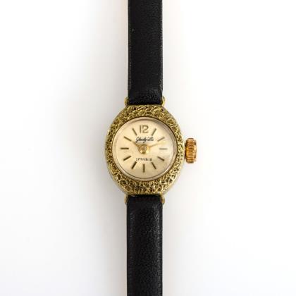 Rundes Gehäuse mit geriffelter Lunette. An schwarzem Lederband mit Dornschließe