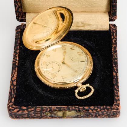 Goldene Art-déco-Sprungdeckeluhr in Etui